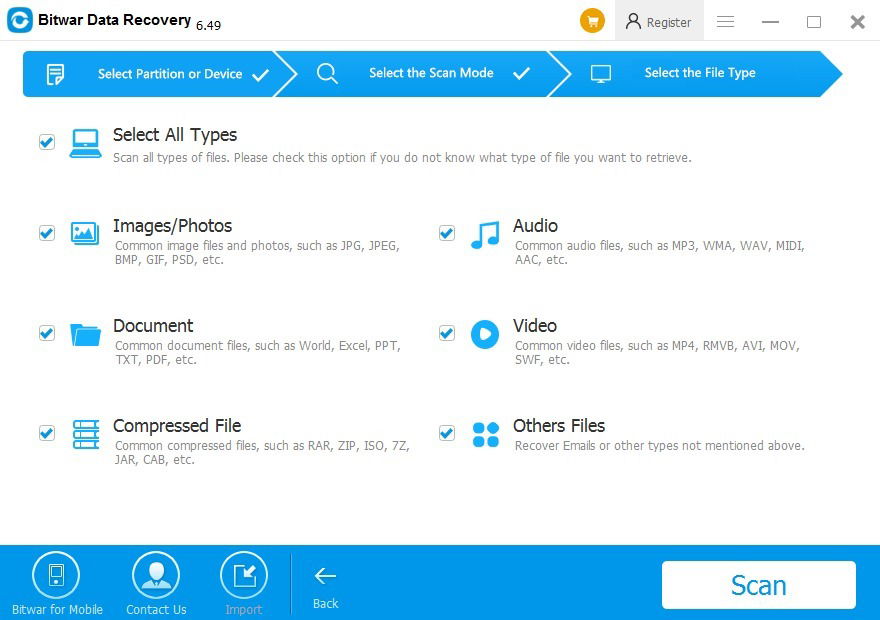 The Bitwar Data Recovery supports all file types: Pictures, Videos, Audio, Emails, Documents and Others Files.