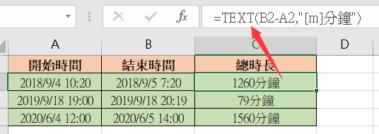 =TEXT(B2-A2,”[h]小時m分鐘”)