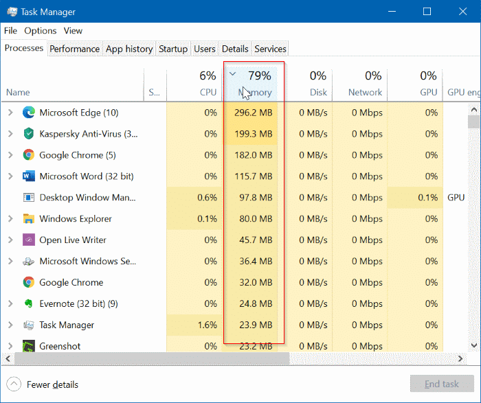 如果您仍然無法釋放 RAM 存儲空間,那麼您可能在不知不覺中執行了太多程式和應用。您應該監控您的電腦RAM的使用情況,以免在您真正需要它之前耗盡。要監視內存,您可以導航到工作管理員以檢查進程。您可以在此處查看正在運行的程式以及它們佔用的類型。